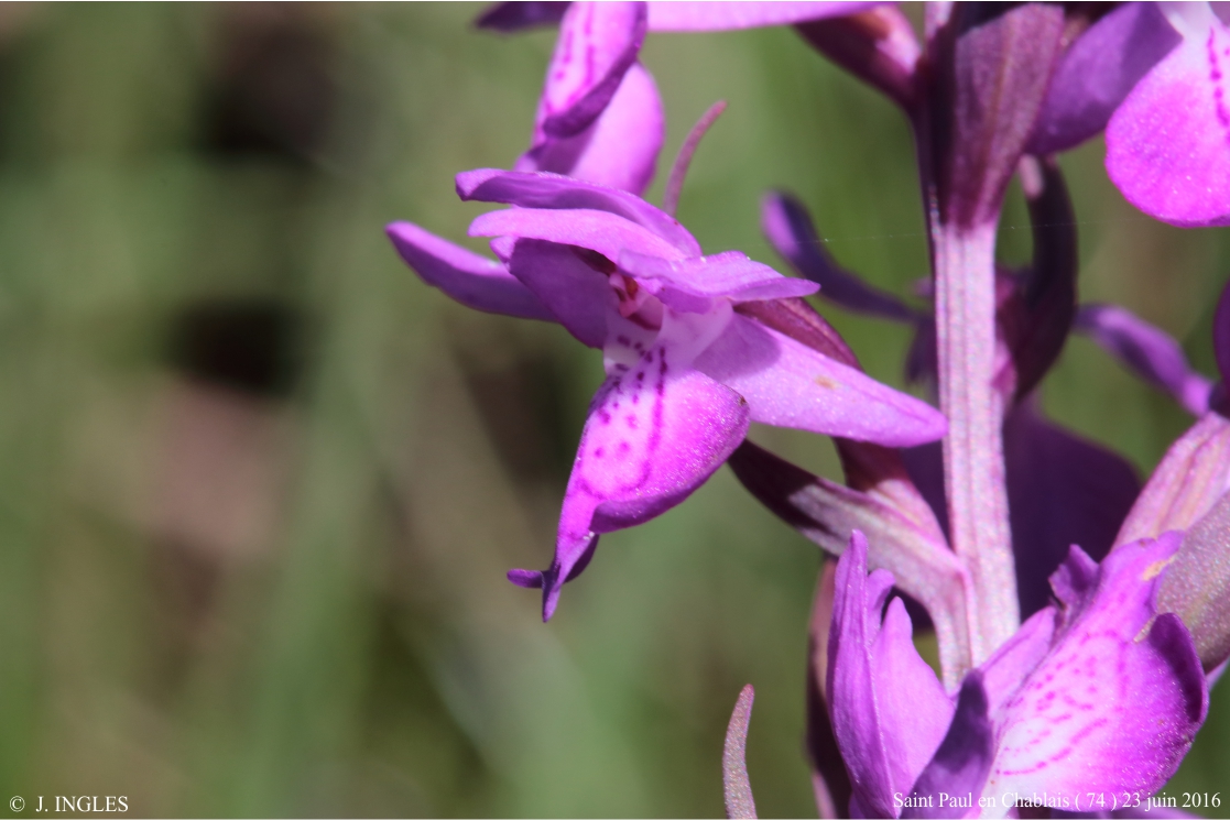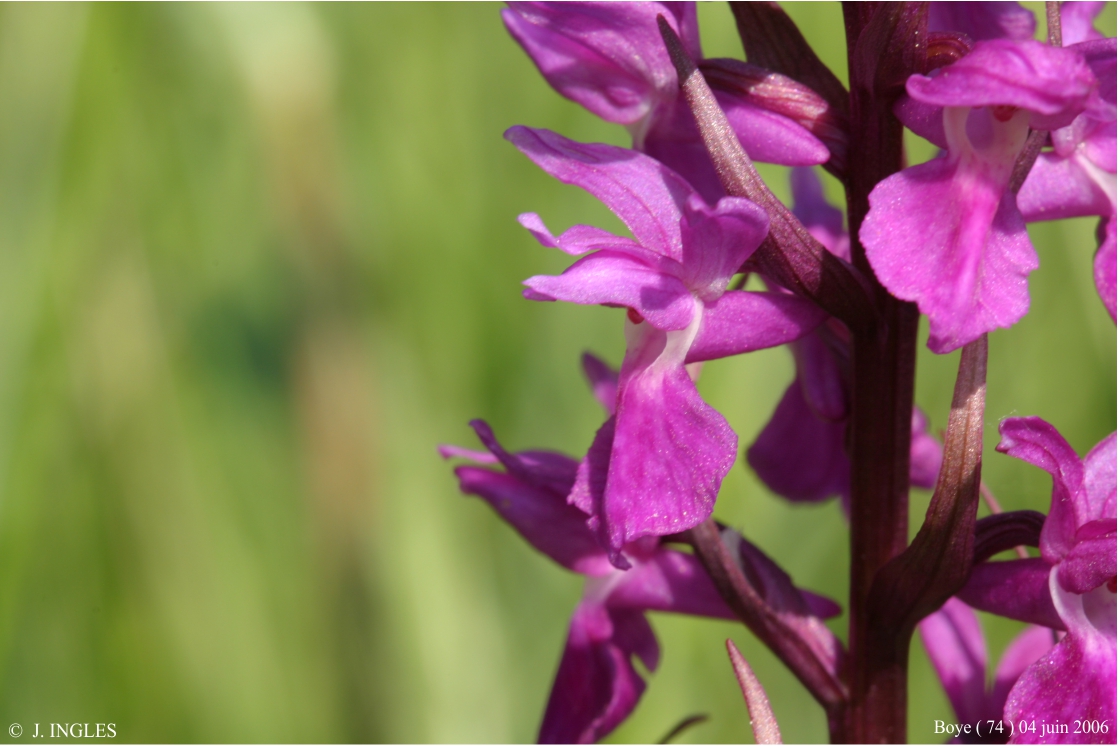 L’inflorescence est lâche, de 8 à 20 grandes fleurs pourpre violacé foncé, le labelle trilobé est orné de lignes et tirets.